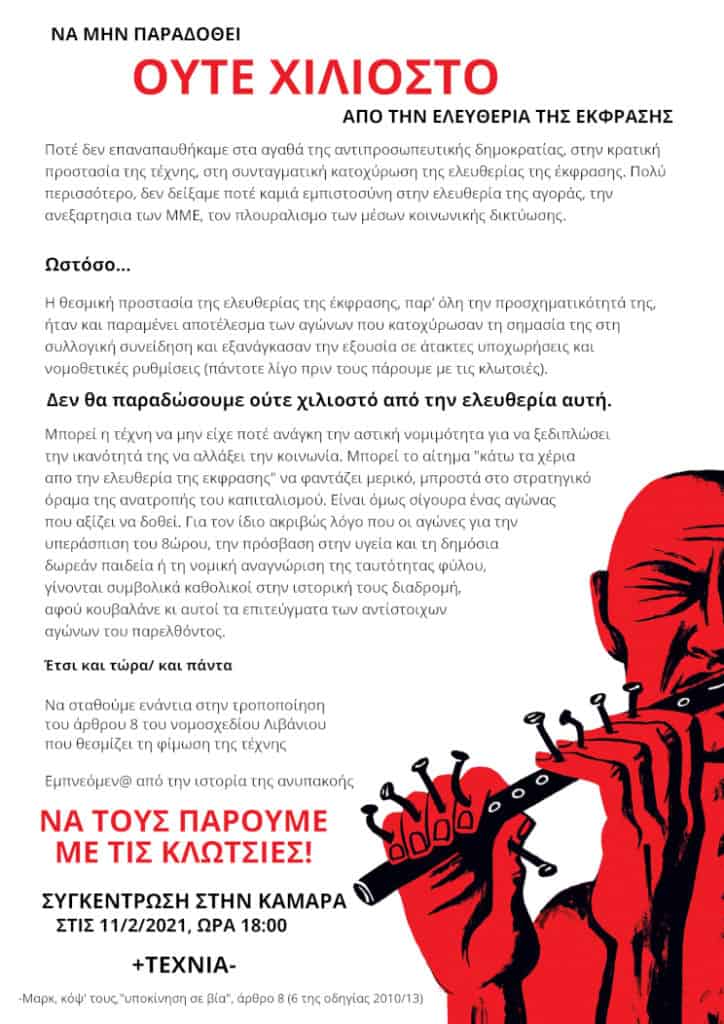 Να σταθούμε ενάντια στην τροποποίηση του άρθρου 8 του νομοσχεδίου Λιβάνιου, που θεσμίζει τη φίμωση της τέχνης.